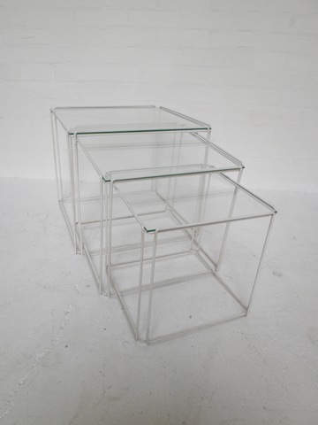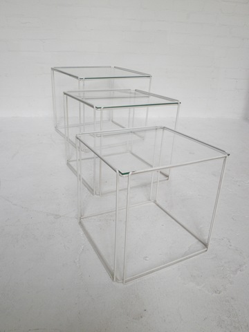 Een stijlvolle miniset, ontworpen door Max Sauze model Isocele, Frankrijk. Max Sauze is bekend geworden door zijn staal ontwerpen. Periode: 1970. Deze kubisch tafels hebben een wit-metalen frame en zijn voorzien van een glasplaat. Prijs: verkocht