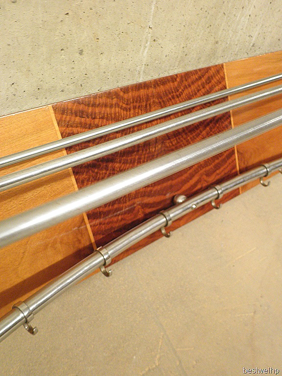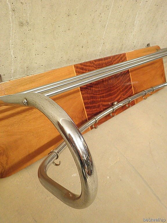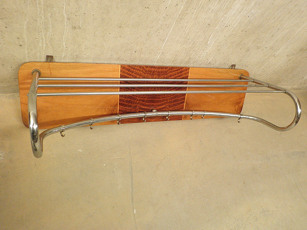 Uniek in zijn soort met een prachtige hout structuur aan de achterwand. Deze chromen buizen kapstok is bijzonder gestroomlijnd en is voorzien van 8 ophanghaken en 3 boven-liggers voor hoeden en sjaals. Herkenbaar aan het Gispen bolletje in het midden van het buizenframe. Afmetingen: B1.00 x H0.24 x D0.36 cm. Gezien zijn leeftijd nog in zeer goede vintage staat. Deze orginele Gispen kapstok is optisch erg stijlvol en staat prachtign in elk interieur! Hangt deze straks bij jou aan de muur? Prijs: verkocht