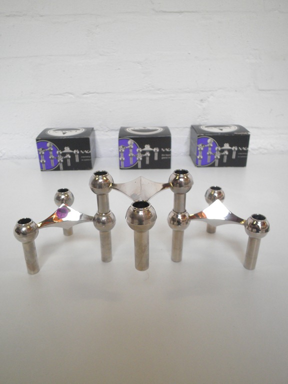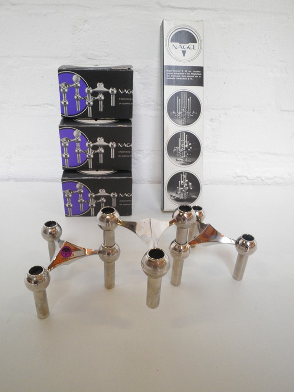 Een originele set van 3 Nagel kandelaars met nog de originele verpakkingsdoosjes & enkele hoge smalle kaarsen. Periode: 1950. Zeer mooi om u kaarsjes deze winter in te laten branden of gewoon als object om neer te zetten op tafel. Op te bouwen in diverse variaties, waardoor er een creatieve vorm ontstaat. Afmetingen: H6 x B10 cm. Gezien de leeftijd in goede vintage staat. Laat die gezellige winter avonden nu maar komen… Prijs: verkocht