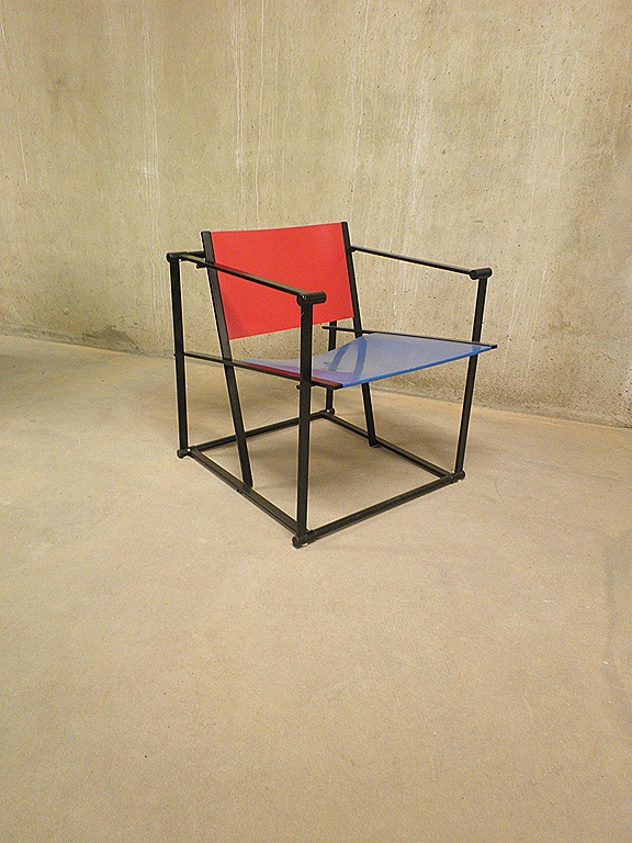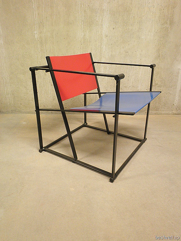Bijzonder kleurrijke design kubus stoel van UMS Pastoe Holland, een ontwerp van Radbout van Beekum. Periode: 1980. Materiaal: metalen frame & houten zitting en rug. Afmetingen: H68 x B62 x D70 cm. Door zijn minimalistische strakke vormgeving doet deze denken aan Mondriaan met zijn kubistische vormen. Uitgevoerd in Rietveld kleuren. Nog in zeer goede staat. Absoluut een eyecatcher voor in huis of in een hal/lobby. Prijs: verkocht
