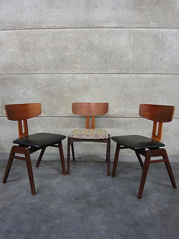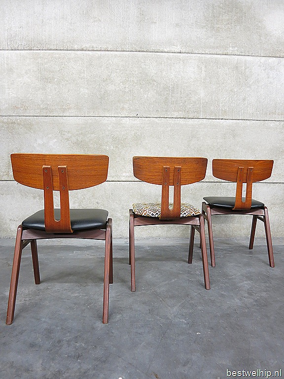 Bijzondere eetkamer stoelen/ easy chairs van UMS Pastoe. Een ontwerp van Cees Braakman. Periode: jaren 50. Het prachtige organisch gevormde frame is gemaakt van teakhout, de verende rugleuning is bevestigd met plywood (combex) Ook wel Combex chair genoemd. Twee exemplaren zijn voorzien van een originele zwarte skai leren bekleding, het andere exemplaar is prachtig bekleed met een bohemien print. Gezien de leeftijd nog in zeer goede vintage staat. Een prachtige set voor thuis of voor aan een lange tafel in een hotel/ restaurant. Prijs: verkocht