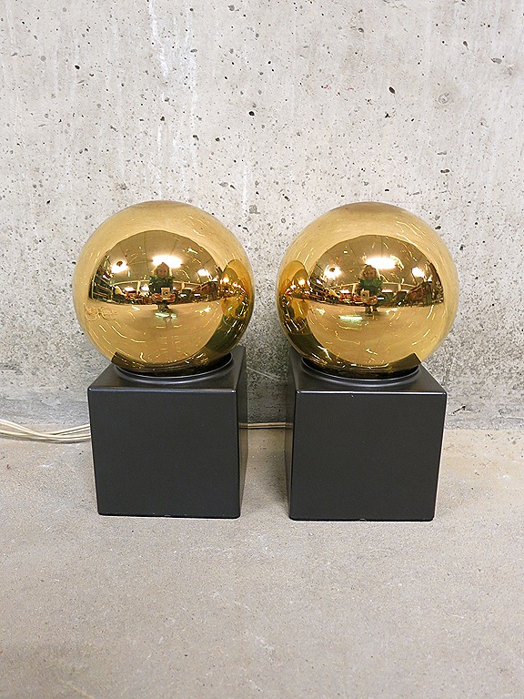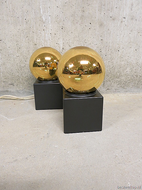 Een bijzondere set van 2 goudkleurige spiegelbol lampen. Producent: Philips Holland. Periode: jaren 70. Afmetingen: H 23 x B11 x D11 cm. Kleuren: zilver met goud. Materiaal: goudkleurige spiegelbol lamp in zwart kunststoffen houder. Ook mogelijk om als wandlamp te gebruiken. Aparte set bollampen, geven prachtig sfeerlicht in de kamer. Gezien de leeftijd nog in goede vintage staat (bovenkant glazenbol beetje ‘dof’) maar desalniettemin een mooie stijlvolle set! Prijs: verkocht