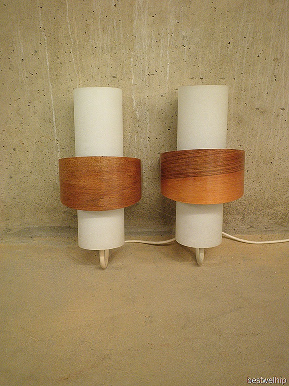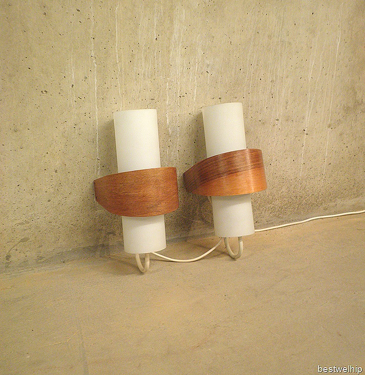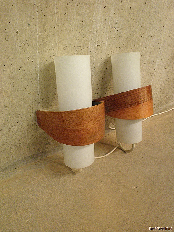 Twee zeer bijzondere plywood-melkglazen wandlampen van het Nederlandse merk Philips. Periode: 1958, mid-century design. Materiaal: wit geëmailleerde metaalconstructie met melkglazen gematteerde kelk en afgewerkt/ omrand met plywood teak houten houder, die ogenschijnlijk zwevend is bevestigd. De lamp vertoont Scandinavische invloeden. Het ontwerp wordt ook wel eens toegeschreven aan Cees Braakman. Afmetingen: H40 x B25 cm. Gezien de leeftijd in goede vintage staat ( 1 klein chipje uit kelk maar valt bijna niet op) Deze lampen geven mooi diffuus licht. Prijs: verkocht