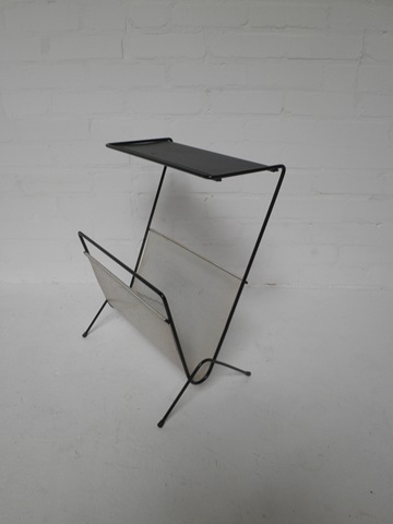 Vintage design lectuurbak van Pilastro Holland, jaren ‘60. Kleur: zwart/wit. Ook te gebruiken als bijzettafeltje. Afmetingen: B 42 x H 56 cm. Het rasterblad aan de bovenkant is B 38 x D 17 cm. Materiaal: metalen frame & metalen geperforeerde plaat. In goede vintage staat.