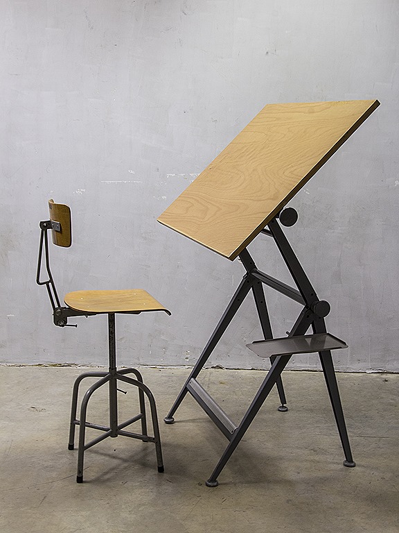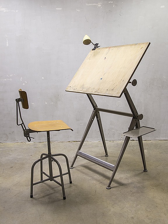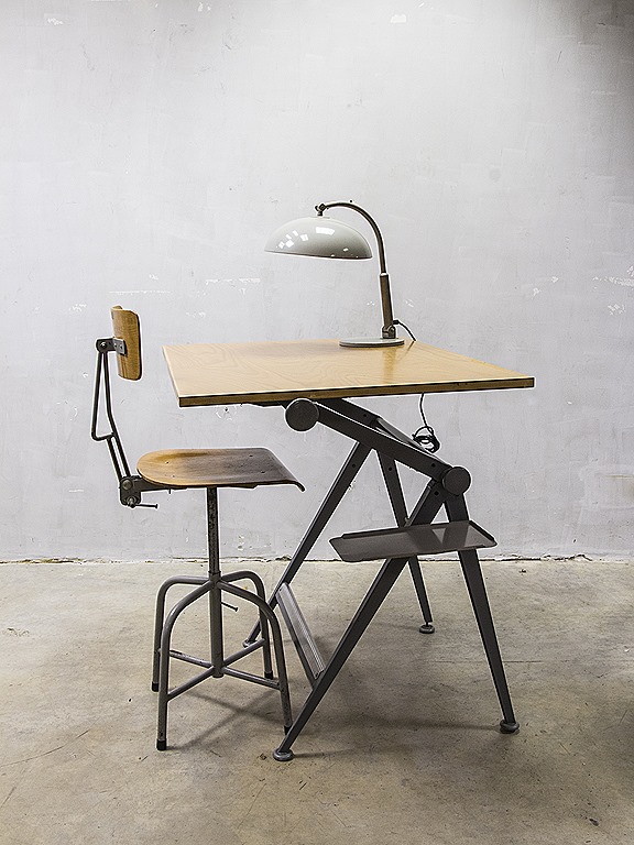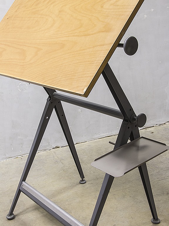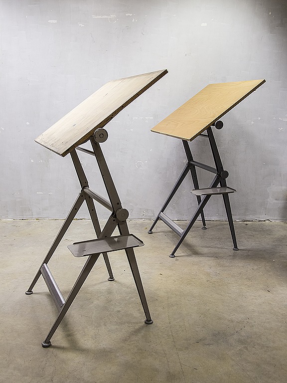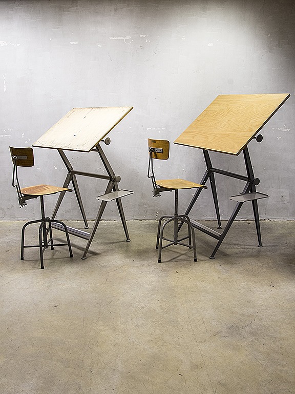 Stoere industriële Ahrend tekentafel/bureau. Een industrieel (bekroond) ontwerp van Wim Rietveld en Friso Kramer voor Ahrend de Cirkel in 1959. Voorzien van een orgineel grijs metalen vintage frame constructie met houten blad. Het tafel blad is in hoogte variabel en kantelbaar, verstelbaar door middel van 2 draaiknoppen (gesigneerd) Bijzonder en steeds zeldzamer om te vinden is het orginele tableau aan de zijkant van de tafel. Minimale hoogte 75 cm ( bureau hoogte) en dan variabel in hoogte te stellen (tekentafel hoogte) Deze tekentafels verkeren beide gezien de leeftijd in goede vintage staat. Zowel als tekentafel en als bureau te gebruiken in huis of op kantoor. Staat dit prachtige exemplaar straks bij jou in huis?
