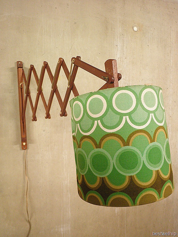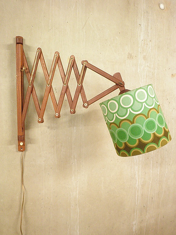 Vrolijke houten vintage schaarlamp met stoffen retro kap. Periode: jaren 50/60. Deze schaarlamp wordt ook wel harmonica lamp genoemd vanwege de uitrekbare arm, verstelbaar in alle mogelijke standen. Materiaal: schaar arm / frame is van prachtig warm hout, groene stoffen kap in originele retro print. Afmetingen kap: hoogte 21.5 cm De lamp verkeert gezien zijn leeftijd in goede staat. Mechanisme: harmonica- schaarbeweging door scharneerpunten die met elkaar verbonden zijn. Stoer en helemaal leuk bij je Deense bureau of gewoon knus voor aan de muur in je woonkamer als leeslamp boven de bank of fauteuil. Prijs: verkocht