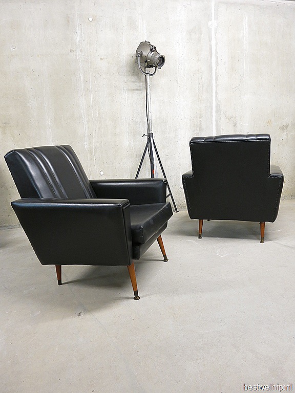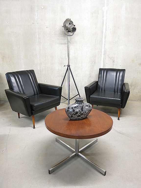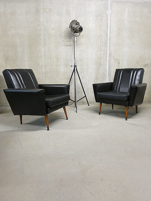Helemaal uit Frankrijk komen deze 2 prachtige skai leren lounge fauteuils in ‘rock a billy’ stijl. Periode: jaren 50. Materiaal: zwart skai leer, houten cocktail poten. Deze lounge stoelen hebben een heerlijk zitcomfort. Gezien de leeftijd nog in goede vintage staat. Absoluut een eye-catcher in je interieur. Mooi voor thuis maar ook prachtig als lounge hoek in een café, restaurant of lobby van een hotel. Prijs: verkocht