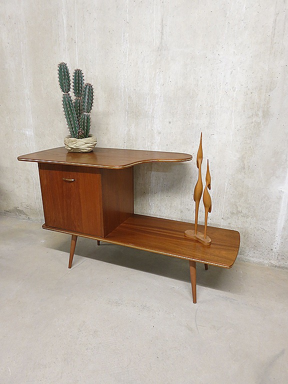 Bijzondere a-symmetrische side table met roteer-baar bovenblad. Periode: jaren 50, ‘Rock a billy’ stijl. Materiaal: hout fineer, taps uitlopende cocktail pootjes, goud accent omranding. Mooi door zijn palet vormig bovenblad en strakke lijnen. Afmetingen: B1.30 x D0.50 x H0.71 cm. Gezien de leeftijd nog in goede vintage staat. Ideaal om neer te zetten als bijzettafel of tv tafel. Een stijlvol exemplaar prachtig in zowel een vintage- als modern interieur. Prijs: verkocht