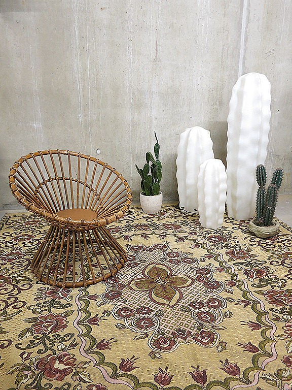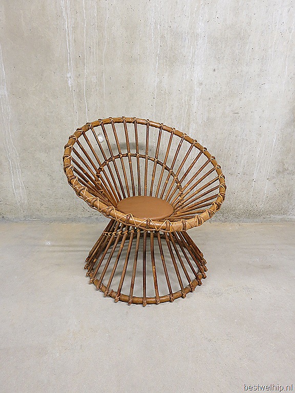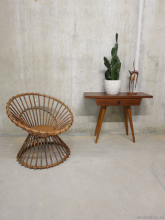 ‘Let the spring begin’… een zeer zeldzame Rohe stoel. De manier van constructie is zeer bijzonder. Periode: jaren 50. Deze rotan fauteuil oogt zeer ruimtelijk in zijn omgeving en doet denken aan een spinnen ‘web’ Voorzien van een camel skai leren kussentje. Door zijn beperkte afmetingen makkelijk te plaatsen. Hoogte 0.65 cm, diameter 0.56 cm. Gezien de leeftijd absoluut nog in zeer goede vintage staat. Absoluut een eye-catcher in de kamer. Prijs: verkocht