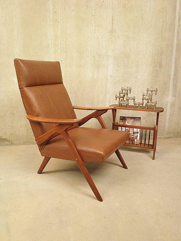 rookstoel jaren 60 vintage design deense stijlHelemaal in de Scandinavische stijl is deze vintage design lounge fauteuil. Ook wel rookstoel genoemd. Periode: jaren 60. Afmetingen: B62 x H97 x D74 cm. Het schitterend lijnenspel geeft deze stoel een tijdloos karakter. Materiaal: bekleding skai leer met gestroomlijnd houten frame. Absoluut een heerlijke relax fauteuil voor in je woonkamer. In goede vintage staat, zowel het skai als het houten frame zijn er goed uit. Absoluut een heerlijke relax fauteuil voor in je woonkamer. Mooi in een modern als vintage interieur. Prijs: verkocht