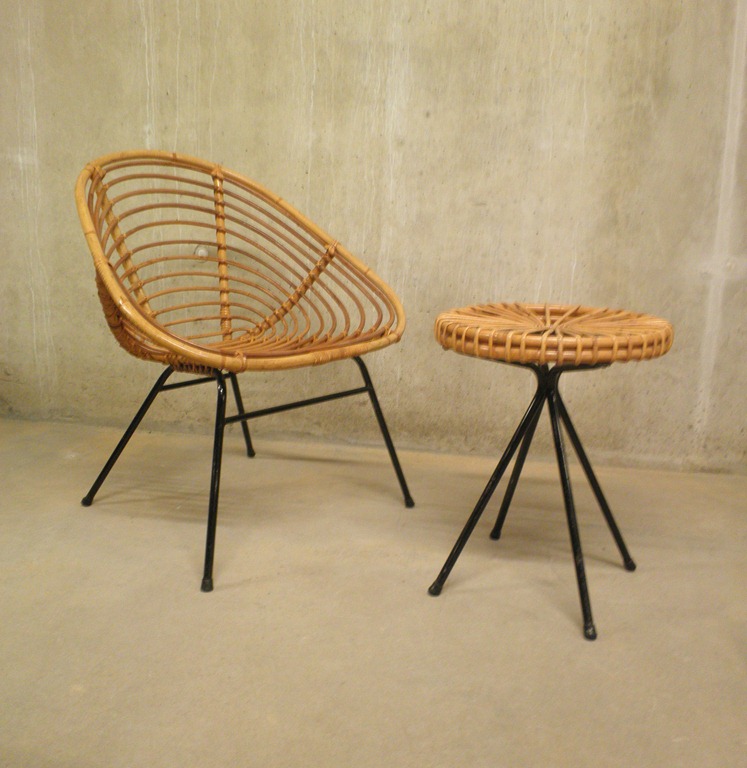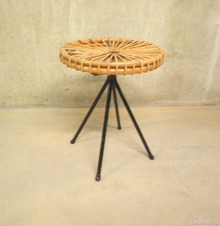 Dirk van Sliedregt kruk bijzettafeltje vintage designrotan vintage design kruk en stoel Rohe NoordwoldeDirk van Sliedregt rattan vintage table and chair