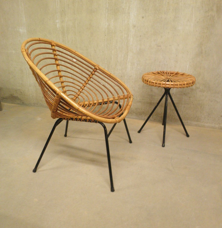 Bijzondere Rotan stoel met origineel vintage design krukje. Zeer mooi door zijn eenvoud. Ontwerp: Dirk van Sliedregt voor Rohe Noordwolde, Holland. Afmetingen kruk: doorsnede 38 cm, hoogte 48 cm. Afmetingen stoel: H77 x D57 x zithoogte 38 cm. De stoel is nog in goede vintage staat, het krukje vertoont enkele vintage sporen aan het riet, desondanks  is is dit absoluut een een bijzondere set. Prijs: verkocht