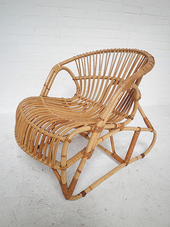 Absoluut een must have voor de liefhebber van de vintage rotan stoel. Periode: jaren 60. Deze stoel heeft een zeer ‘ruimtelijke’ effect is heeft een bijzondere vormgeving. Ontwerper: onbekend. Afmetingen: D78, zitdiepte 46 cm x H76 cm. Prachtig om neer te zetten in je serre, woonkamer of onder het overdekte terras. Heerlijk om relaxed een boekje in te lezen of om in weg te dromen…. Gezien de leeftijd aan een zijde 1 losse rotan ‘draad’ bij de armleuning, verder in zeer goede vintage staat. Een prachtig vintage exemplaar. Prijs: verkocht