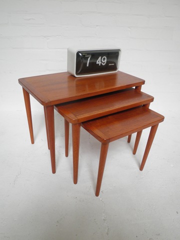Stijlvolle set van 3 design bijzettafels in Deense stijl. Pooten lopen taps toe. Periode: jaren 60. Materiaal: teakhout. Afmetingen: B57 x D34 x H40 cm, midden: B 46,5 x D34 x H36 cm, kleinste B35,5 x D34 x H32 cm. Absoluut nog in perfecte vintage staat!