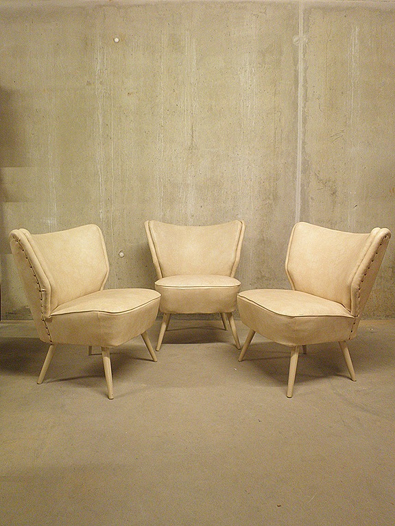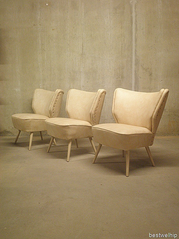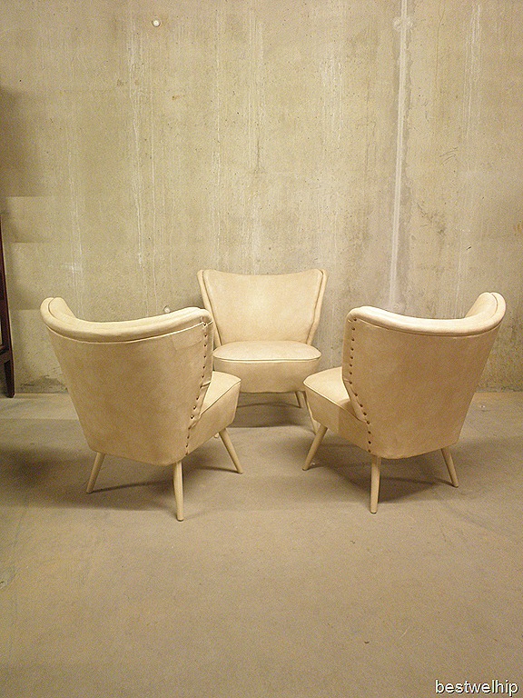 Bestwel bijzonder….3 identiek dezelfde cocktail stoelen in crème kleur. Waarschijnlijk van Artifort. Door de lage afmetingen ideaal om bij te zetten. Materiaal: skai leer, houten poten ( ecru geverfd). Periode: jaren 50. Deze stoelen zijn opnieuw gestoffeerd met nog een goede zit/vering. Ideaal om neer te zetten in je woonkamer of lounge hoek van een hotel/restaurant/bar/winkel. Prijs: verkocht