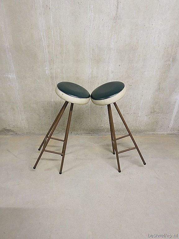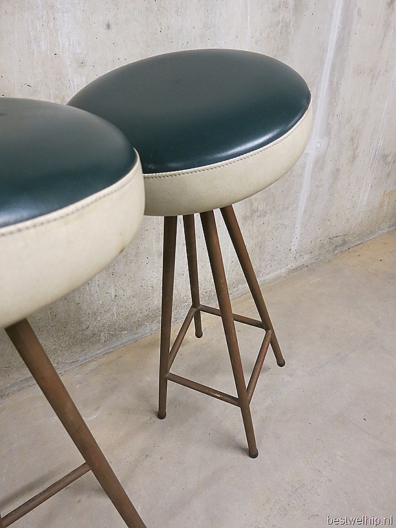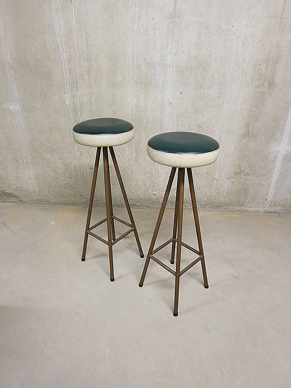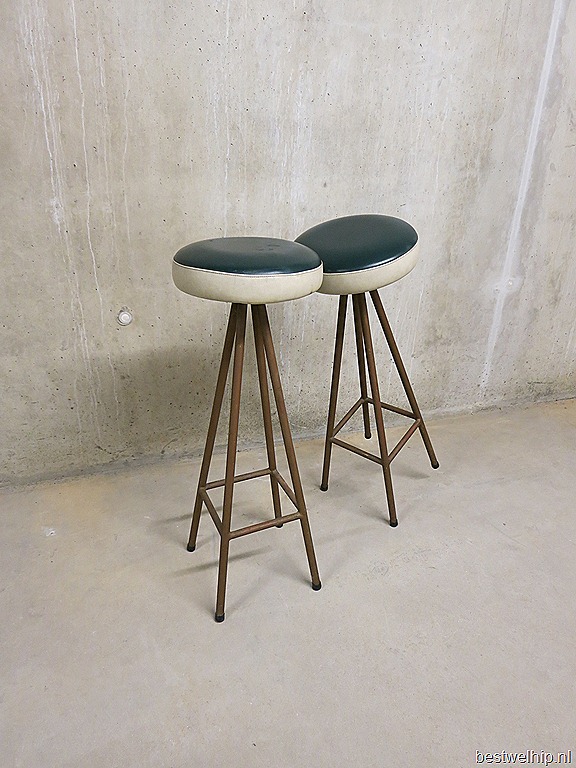 Absolute eye-catchers deze unieke barkrukken. Periode: jaren 50. Materiaal: prachtige ranke en slanke metalen frame, zachte skai leren zitting. Nog in zeer goede vintage staat. Mooi voor achter de bar, absoluut een meubelstuk waar je een glimlach van op je gezicht krijgt. Wie voelt zich nu niet thuis op deze bar kruk met een lekkere cocktail in je hand… Prijs: verkocht
