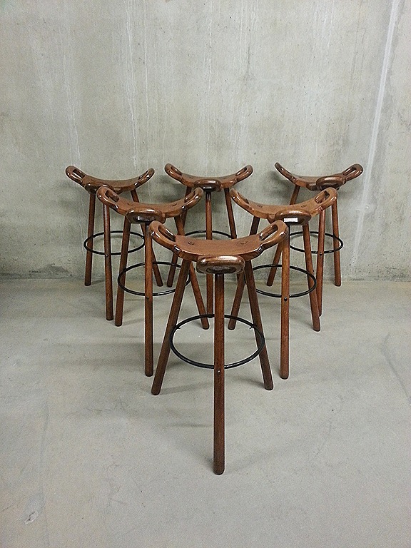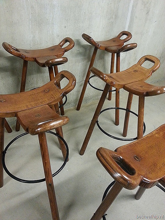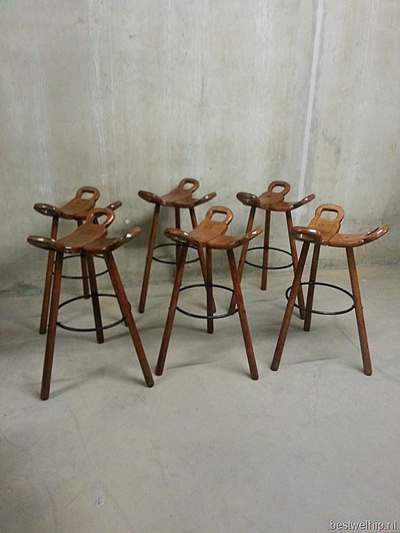Uniek in zijn vormgeving, ook wel ‘Spanish’ stool genoemd, bijzondere zeldzame vintage design krukken. Periode: 1965. Land van herkomst: Spanje. Gemaakt van zeer dik zwaar hout in combinatie met metalen ring. Afmetingen: H0.84 x B0.52 cm. Nog in zeer goede vintage staat. Deze stoelen zijn zeer decoratief & prachtig voor in een bar/restaurant/ hotel of lobby maar ook in een Scandinavisch interieur. Heb jij die opdracht om een mooie bar/ lobby in te richten dan is dit wellicht wat jij zoekt! Stoer & stijlvol tegelijk, een eye-catcher voor aan de bar. Prijs: verkocht