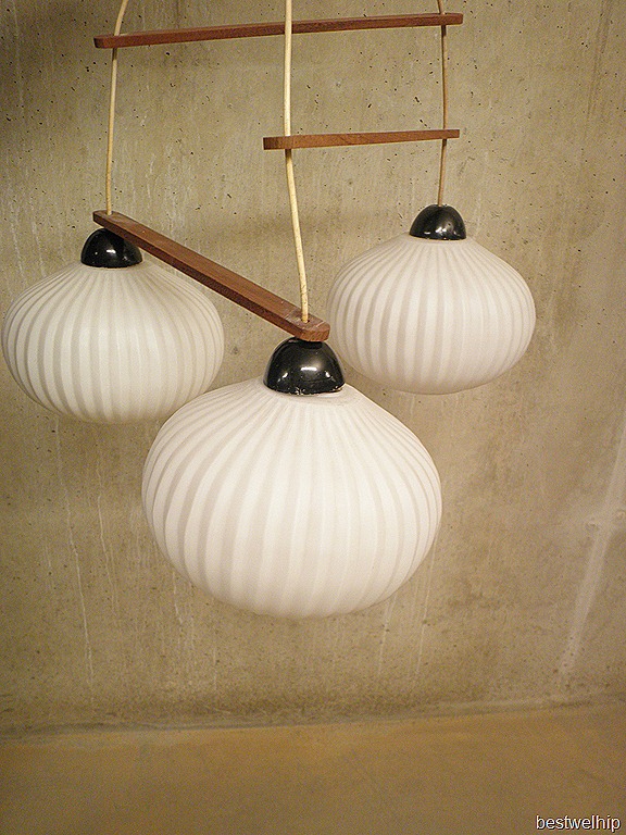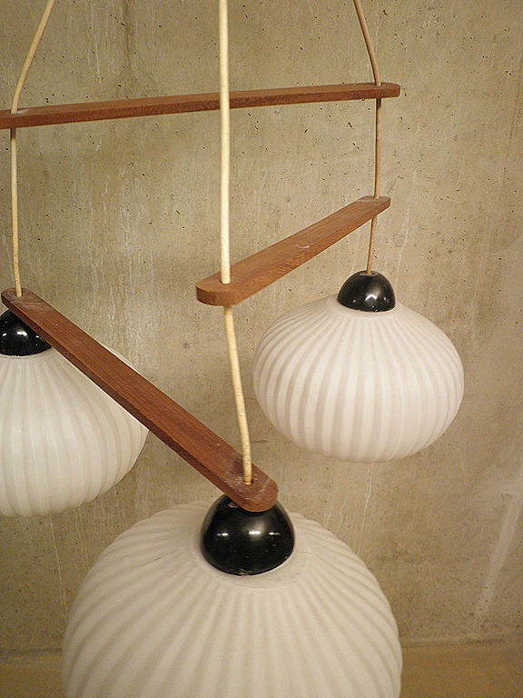 Prachtige hanglamp in Deense stijl voorzien van 3 witte glas kelken. Periode: luster uit de jaren 50/ 60. Mogelijkheid om op verschillende manieren te hangen door de houten stokjes te verschuiven. Materiaal: hout met opal melkglazen kelken. Mooi warm licht en deze lamp is in hoogte verstelbaar. Prachtig voor boven een salontafel of voor in een hal. Nog in zeer goede vintage staat. Prijs: verkocht