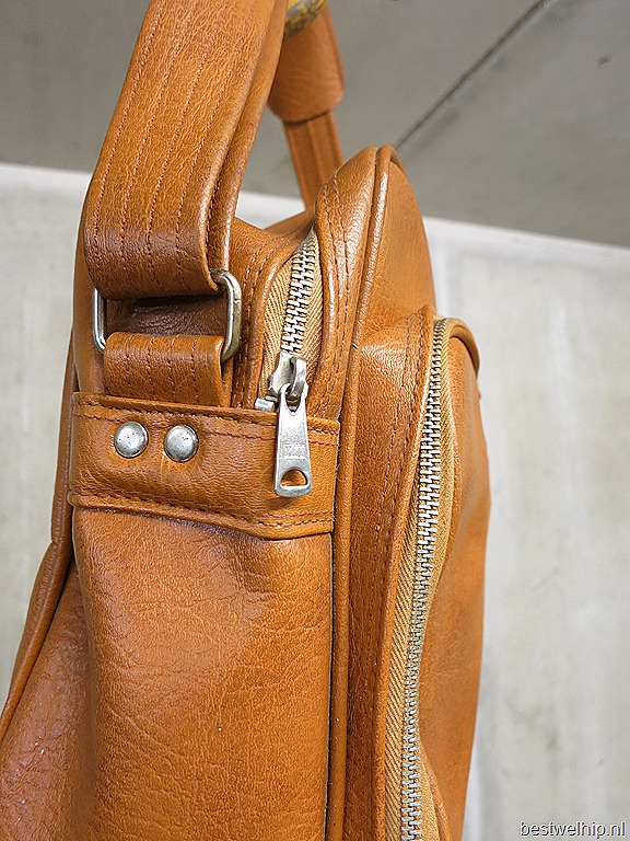 Stoere leren vintage schoudertas in een prachtige safari camel kleur. Periode: jaren 60/70. Materiaal: skai leer. Sluiting met een rits. Voorzien van 1 voor-vak met rits om eventueel de telefoon en portemonnee in op te brengen en 1 groot binnen vak. Afmetingen: B0.33 x D0.15 x H0.29 tas en is in hoogte verstelbaar met hengsel. Nog in zeer goede vintage staat. Steel jij straks de ‘show’ met deze vintage tas? Prijs: verkocht
