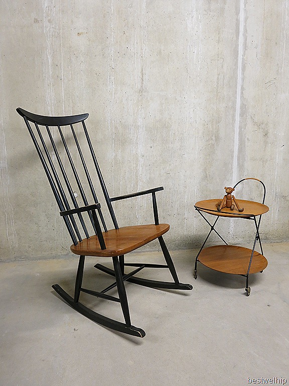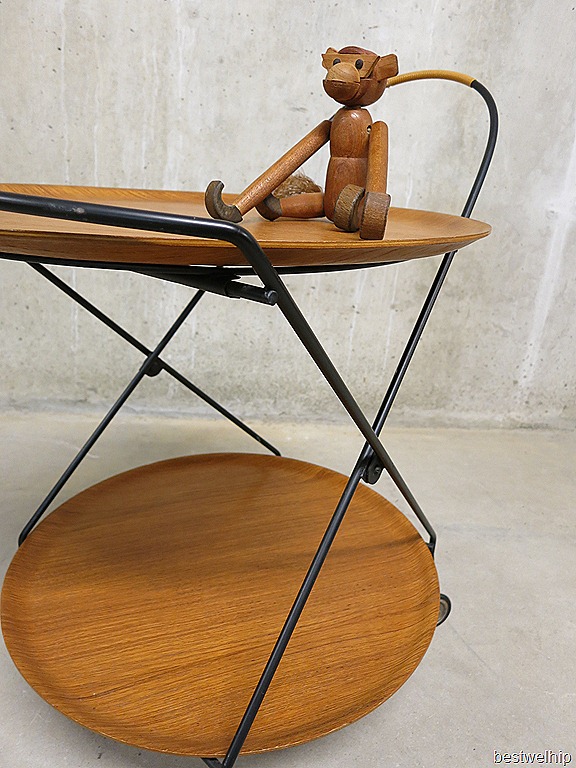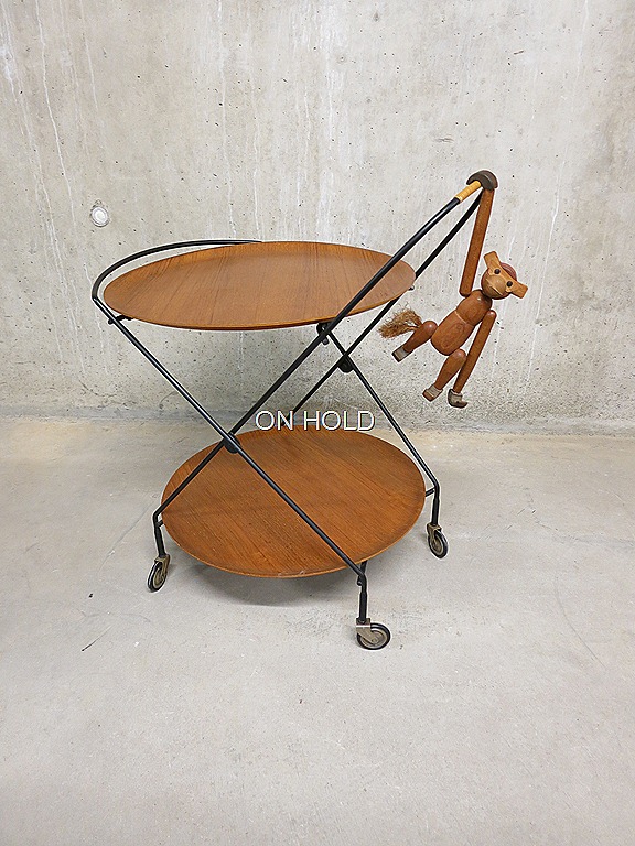 Prachtige vintage Zweedse teak theewagen/ trolley voorzien van 2 afneembare dienbladen. Het zwart metalen frame is volledig inklapbaar/demontabel. Periode: jaren 50. Ontwerper: onbekend. De onderkant van de dienbladen is gemerkt: sticker Impala teak. Nog in zeer goede vintage staat. Prachtig om bij te zetten als bijzettafel in de kamer of keuken. Een uitdagende combinatie tussen het industriële metalen frame en de warme teak houten dienblad. Prijs: verkocht