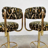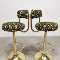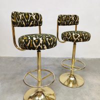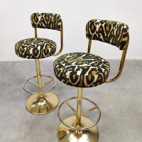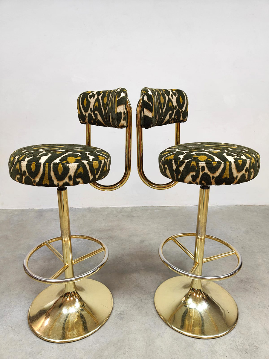 Two of a kind! Een beetje glam & een beetje jungle, deze 2 unieke vintage design Cobra barkrukken van Borje Johanson zijn echte ‘conversation starters’. Volledig opnieuw gestoffeerd in een prachtig panter dessin stof van Pierre Frey. De combinatie van het goudkleurige frame met deze prachtige groene panther flock print maakt deze krukken uitgesproken, stijlvol én speels tegelijkertijd. Perfect voor aan je kookeiland of bar. Zoek jij net ff meer flair aan de bar dan een standaard barkruk? Dan passen deze twee vintage design barkrukken wellicht perfect in jouw interieur. Zweeds vintage design uit de jaren ’70. Absolute eye-catchers. Ready to roar!