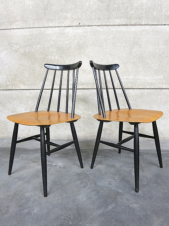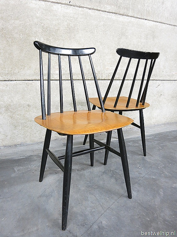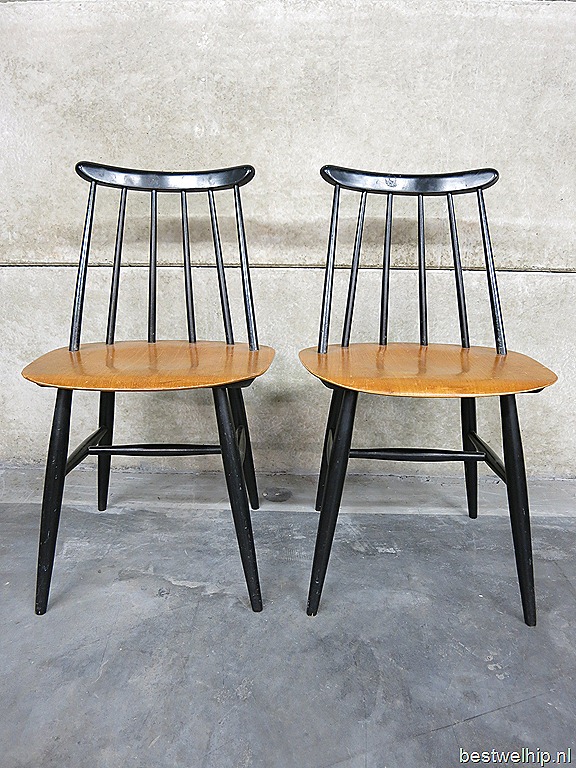Twee prachtige originele Tapiovaara spijlen stoelen. Ook wel Fanett chairs genaamd. Absoluut een Scandinavisch design icoon. Periode: 1950. Ontwerper: de Finse Ilmari Tapiovaara. Fabrikant: Edsby-verken Zweden. Bijzonder omdat deze twee kleurig is, zwarte rugleuning en poten & houtkleurige zitting. De onderkant is gestempeld. Gezien de leeftijd nog in goede vintage staat. Staan deze tijdloze exemplaren straks bij jou aan tafel? Prijs: verkocht