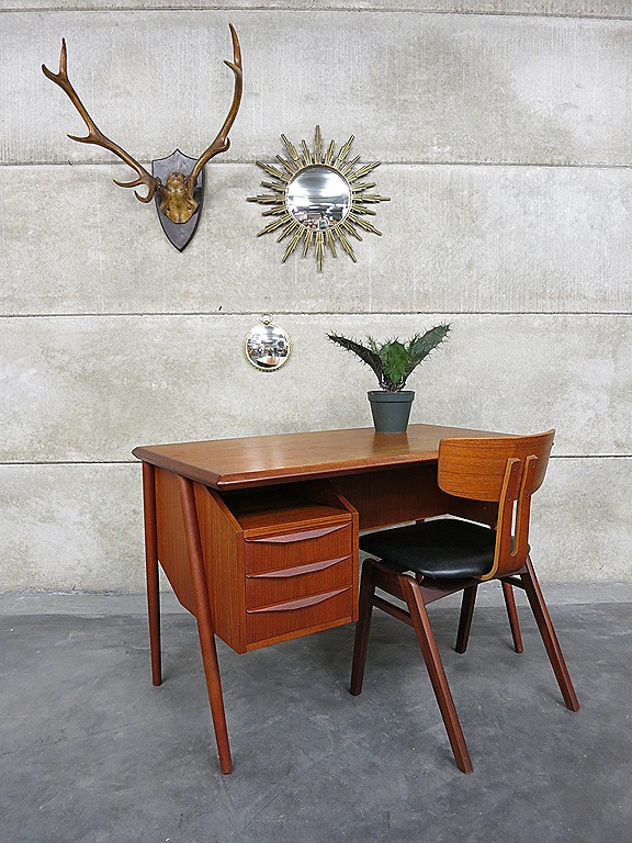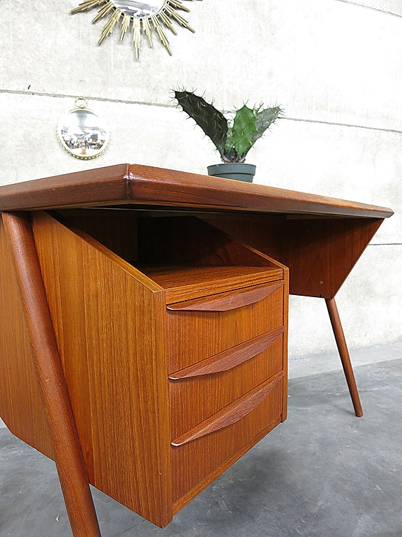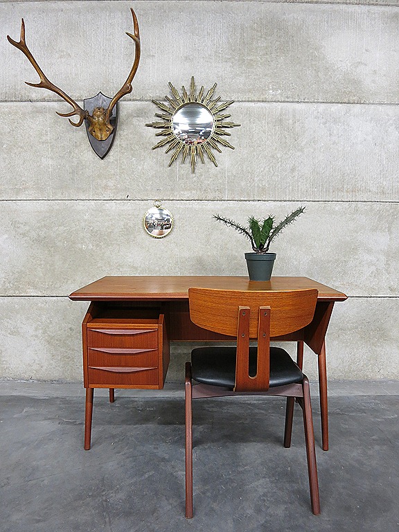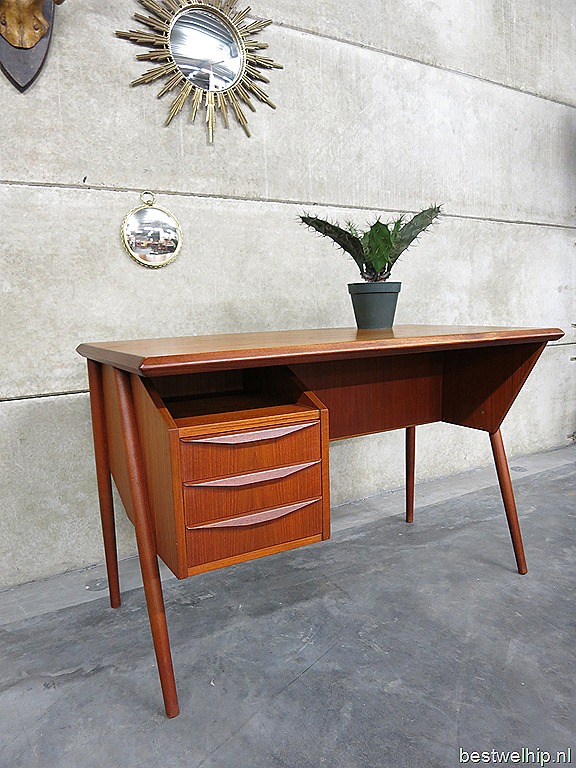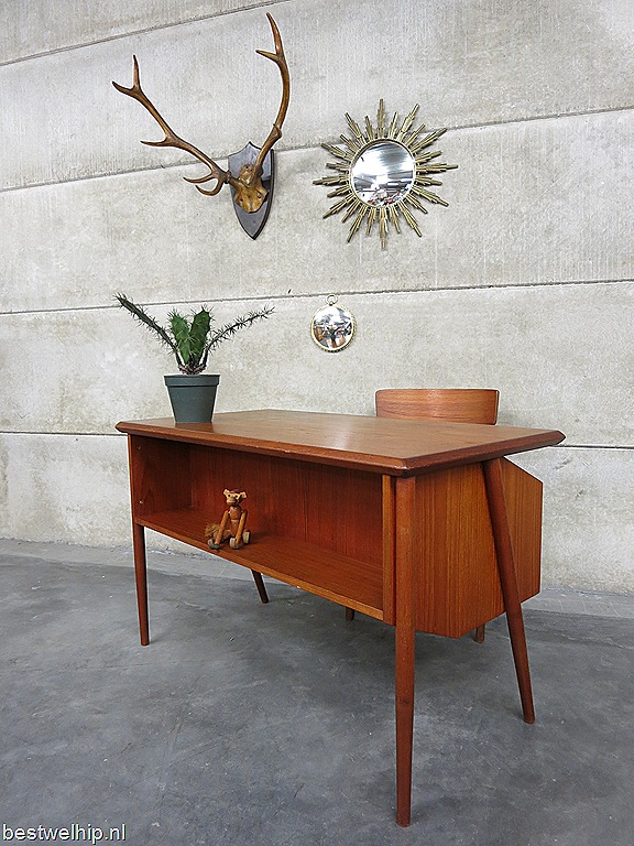Zeldzaam vintage Deens design bureau. Een ontwerp van Gunnar Nielsen Tibergaard. Periode: jaren 60. Materiaal: teakhout. Prachtig voor het oog door zijn a-symmetrische stroomlijning & in prachtige handvaten. Voorzien van boekenkast ruimte aan de achterzijde. Ook mooi om te gebruiken als room divider. Makkelijk te plaatsen door zijn beperkte afmetingen. Afmetingen: B115 x D61 x H73 cm. Gezien de leeftijd in goed gebruikte vintage staat. Ben jij al een hele tijd opzoek naar dit exemplaar. Prijs: verkocht