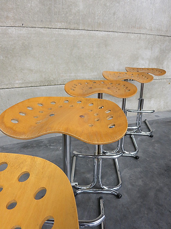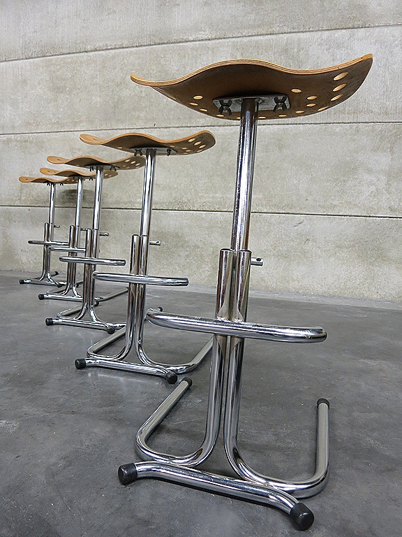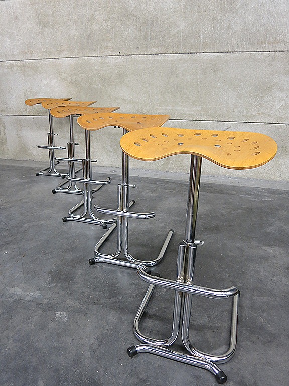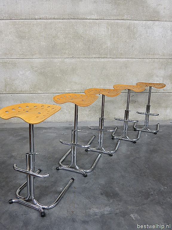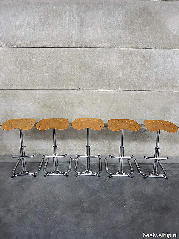 Unieker vintage design barkrukken, ontworpen door Achille Castiglioni in de jaren 70 geproduceerd. Uniek in deze barkruk uitvoering. Deze tractorkrukken zijn een bijzonder exemplaar & een goede mix tussen industrieel & design. Land van herkomst: Italië. Bestaande uit maar 3 onderdelen, de metalen houten tractor zitting, ‘n vleugelmoer schroef, ‘n chromen buisframe/ voet. Buiten zijn bijzondere uiterlijk biedt deze constructie ook een heerlijk zitcomfort. Afmetingen: B44 x D48 x zithoogte 74 x zitdiepte 35 cm. Gezien de leeftijd in goed gebruikte vintage staat. Bijzonder contrast tussen het warme hout en het chroom kleurige stalen frame. Open jij straks die bar waar deze vintage krukken niet mogen ontbreken? Of gewoon mooi voor thuis aan de keukenbar. Staat prachtig in een vintage als in een modern design interieur.