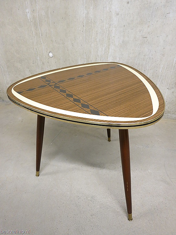 Mid century design bijzettafel/ coffee table uit de jaren 60. Mooi bijzonder blad op stoere hoge cocktail poten. Materiaal: houten poten, formica blad met prachtige tekening, goudkleurige kunststof rand. Gezien de leeftijd nog in hele goede vintage staat. Prachtig in zowel een modern als vintage interieur. Prijs: verkocht