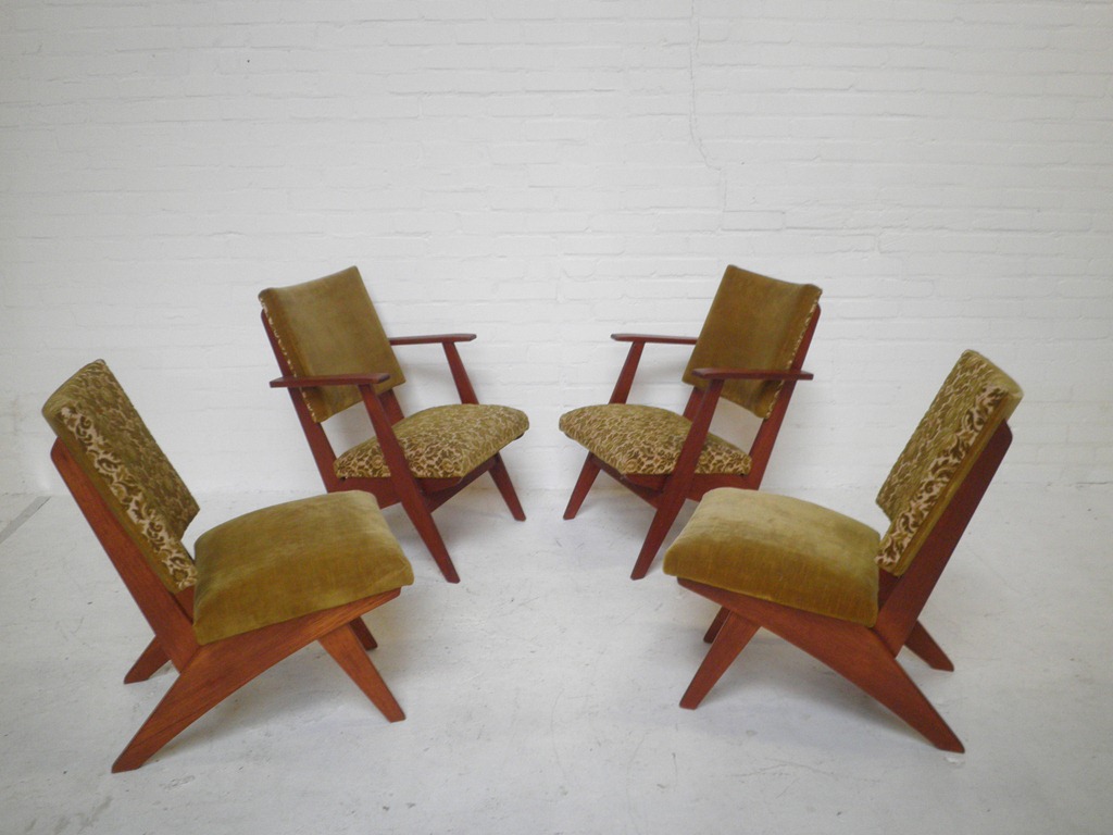 Zeer bijzondere en zeldzame set van 4 vintage ‘Scissor chairs’ waarschijnlijk van Pastoe (Holland) ontworpen door Jan van Grunsven. Hij werkte in de jaren 50/60 in het atelier van Gerrit rietveld en staat bekend om zijn prachtig ‘sculpturale vormgeving’. Ook doet deze set doet denken aan de ‘Scissor chair’ van Pierre Jeanneret voor Knoll, aan de ‘Scissor chair’ van Folke Ohlsson voor Dux of aan Hans Wegner. Desalniettemin is het een exclusieve set van 4 vintage design fauteuils met een echt Deens karakter. Zeer solide constructie van solid teak hout, ze ogen niet alleen fantastisch maar zitten ook nog eens heerlijk. In zeer goede vintage staat. Deze vintage design fauteuils zijn prachtige staat (zowel bekleding als hout). Helemaal ‘hot’ zijn ze als je ze eventueel opnieuw bekleed met een mooie beige bouclé stof of stoere antraciet kleurige visgraat. Prijs: verkocht