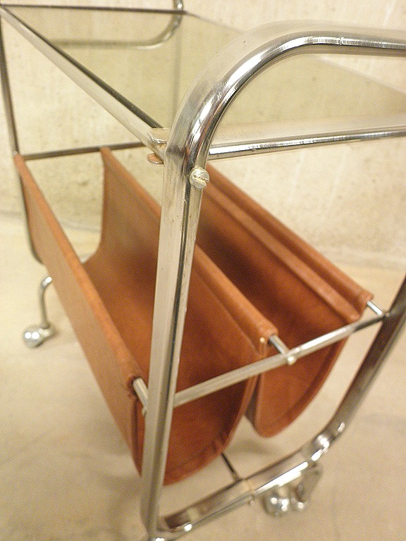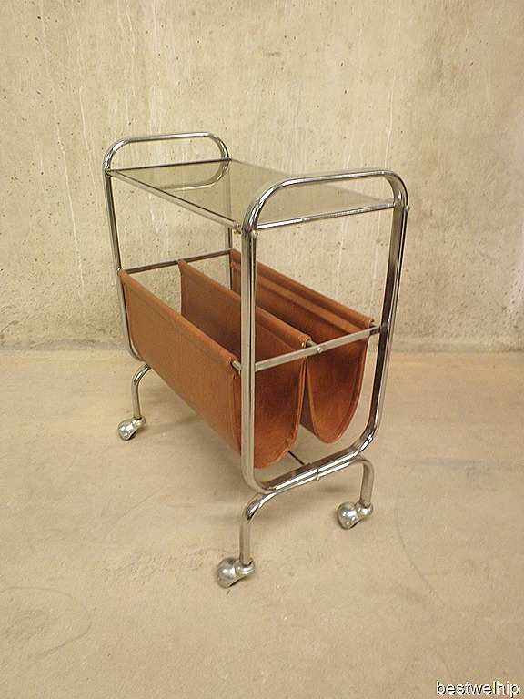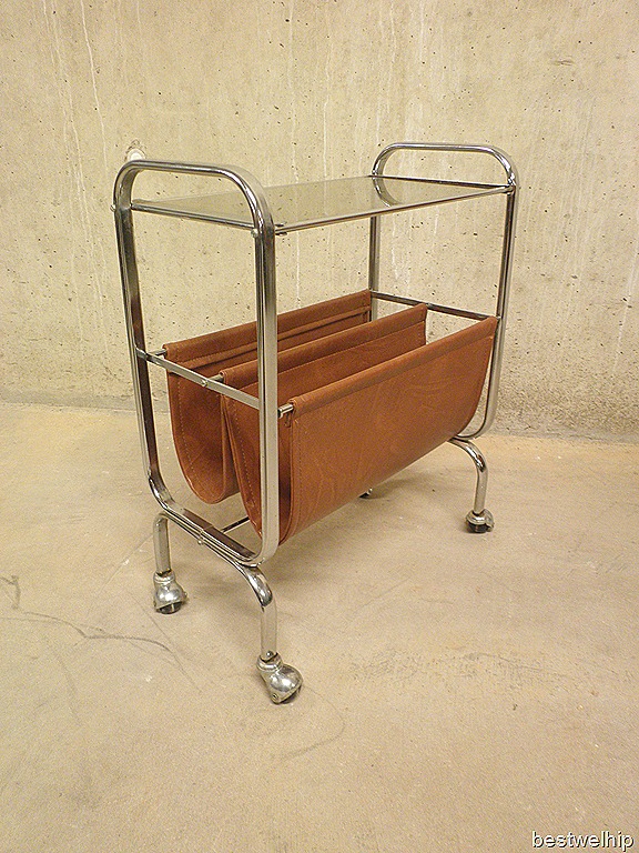 ‘One of a kind’ is deze stoere vintage design lectuurbak / bijzettafel op chromen zwenkwielen. Periode: jaren 60. Materiaal: leren lectuur map, chromen frame met zwenkwielen, bovenblad is een glasplaat. Afmetingen: B43 x H54 x D23 cm. Nog in zeer goede vintage staat. Ideaal om al je tijdschriften in op te bergen maar ook fantastisch als bijzettafel naast je bank/ fauteuil om je drinken op te plaatsen. Absoluut een eye-catcher in je interieur. Een zeer bijzonder exemplaar. Prijs: verkocht