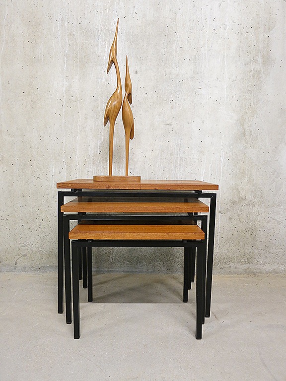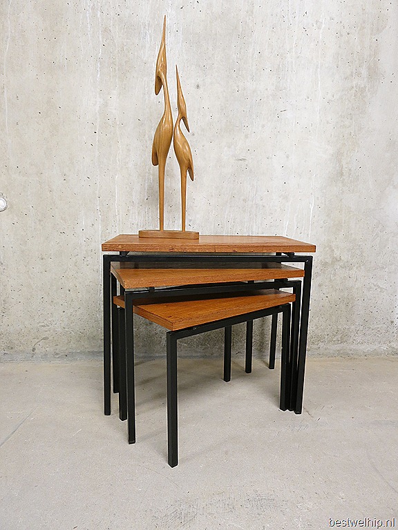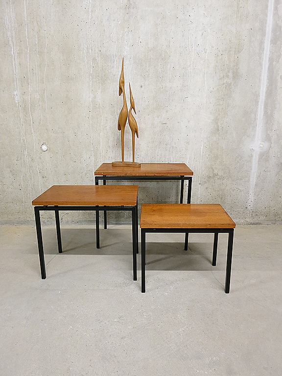 Bijzondere vintage design bijzettafeltjes/ nesting tables van Cees Braakman voor Pastoe. Door zijn strakke vormen en optisch zwevend blad een zeer mooi exemplaar. Het optisch zwevend blad oogt stijlvol en de metalen poten zijn stoer en industrieel. Periode: jaren 50/60. Afmetingen: B50 x D35 x H45 cm (hoogste tafel) Gezien de leeftijd nog in goed gebruikte vintage staat. Materiaal: houten blad in combinatie met stalen metalen frame. Zeer mooi in een minimalistisch interieur. Ideaal om bij te zetten in de kamer als hoektafel naast de bank of als bijzettafel. Prijs: verkocht