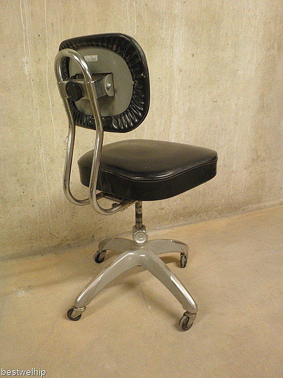 Een stoere & industriële vintage bureaustoel. Periode: jaren 50. Gemerkt aan de achterkant Erca Staal. Dit exemplaar is hoogte verstelbaar. Materiaal: metalen frame met een zwarte skai leren zitting, verrijdbare zwenkwielen. Zeer mooie metalen sterpoot doet ook denken aan de Gispen bureaustoel. Gezien de leeftijd nog in goede vintage staat. Staat deze stoel straks bij jou thuis achter je bureau? Prijs: verkocht