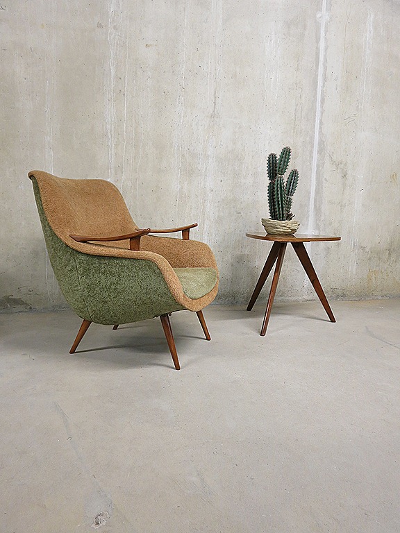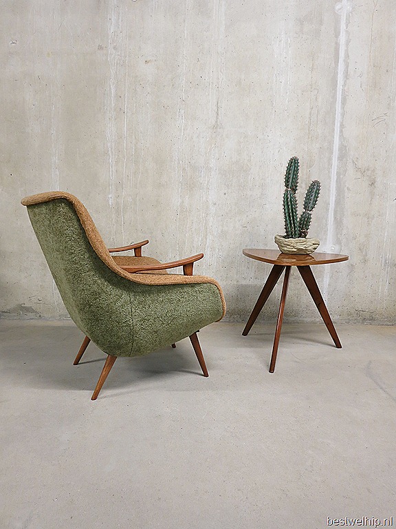 Prachtige Dutch design lounge fauteuil/ club fauteuil. Bijzonder door zijn ronde lijnen. Periode : jaren 50. Ontwerper: onbekend. Prachtige vormgeving met zeer aparte armleuningen ( Deense stijl) en taps uitlopende cocktail pootjes. Bijzondere soft tone velour in lever kleur in combinatie met licht groen. Afmetingen: H0.81 x B0.73 x D0.83 cm, zithoogte 0.38 cm, zitdiepte 0.48 cm. Nog in goede vintage staat. Ideaal om neer te zetten in de living of lounge bar. Prijs: verkocht