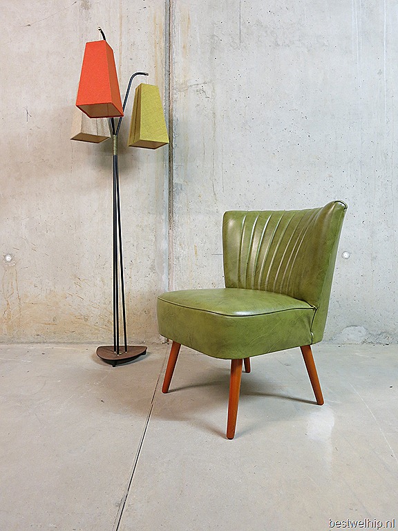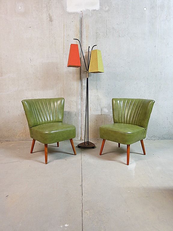 Een authentieke set vintage design cocktail stoelen. Periode: jaren 50. Materiaal: skai leren zitting in een bijzondere kleur…lime groen met houten cocktail poten. Een comfortabele zit. Gezien de leeftijd nog in goede vintage staat. Bijzonder mooi in deze vrolijke kleurstelling. Ideaal om neer te zetten in een hotel lobby, bar, winkel interieur of gewoon bij je thuis. Staan deze clubfauteuils straks bij jou te pronken? Prijs: verkocht