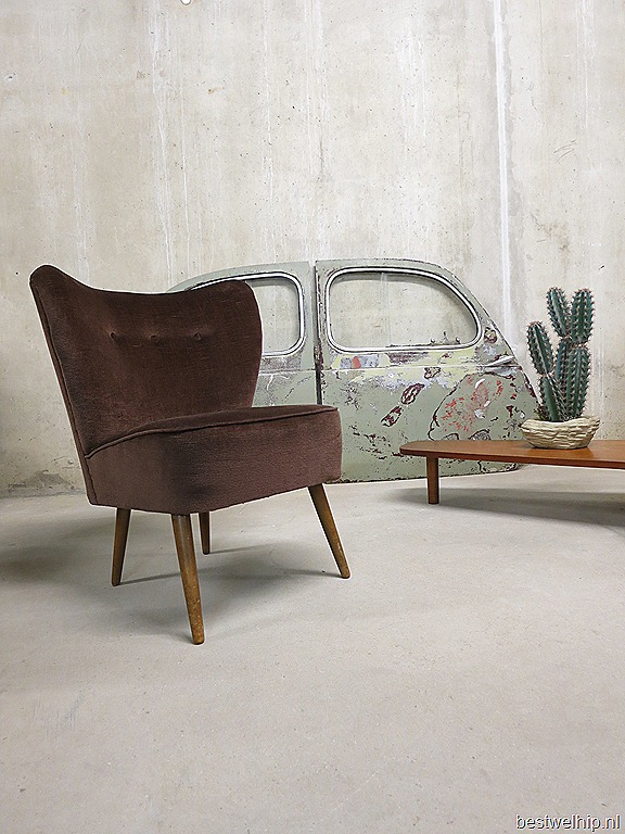 Originele vintage cocktail stoel in bruin velours. Periode: jaren 50. Materiaal: originele velour stof, taps uitlopende teak houten cocktail poten. Erg leuk als decoratie in je winkel, voor in een cocktail bar of gewoon om neer te zetten in huis. Gezien de leeftijd nog in zeer goede vintage staat. Deze cocktail chair, is tijdloos en weer zeer geliefd momenteel. Door zijn beperkte afmetingen ideaal om bij te zetten. Prijs: verkocht