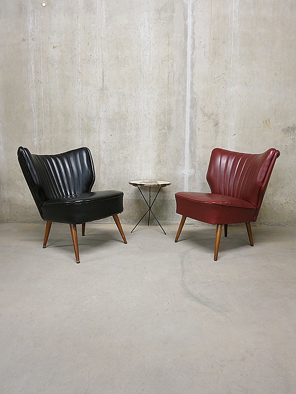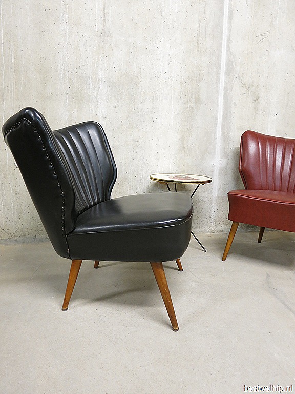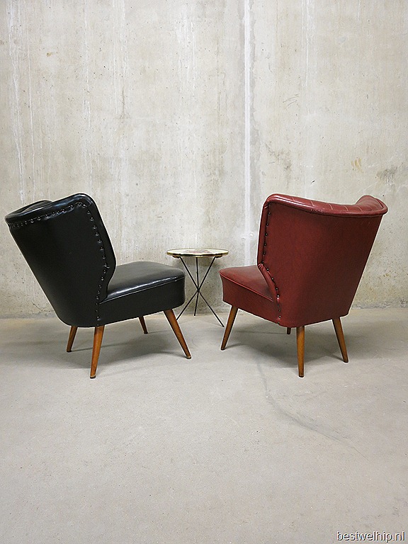 Een prachtige set cocktail stoelen. Deze clubfauteuils zijn hoogstwaarschijnlijk van Artifort. Periode: jaren 50. Materiaal: origineel zwart en rood skai leer, houten teak pootjes. Gezien de leeftijd absoluut nog in zeer goede staat. Afmetingen: H75 x D60 x B67, zithoogte 40, zitdiepte 45 cm. Deze cocktail chairs, zijn tijdloos en ideaal om bij te zetten. Doordat ze laag zijn ogen ze mooi ruimtelijk in de kamer. Prijs: verkocht