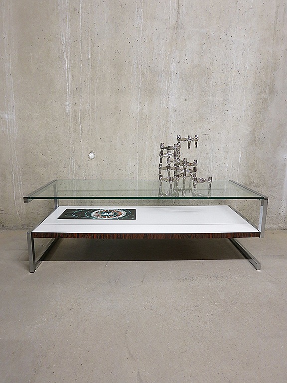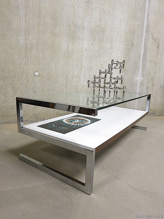 Zeer stijlvolle vintage salontafel. Prachtig a-symmetrische chromen frame, lijkt optisch te ‘zweven’. Zware transparante glasplaat. Het witte formica blad is ingelegd met een prachtige tegel en afgebiesd met een hout fineer rand. Kleurrijk maar toch subtiel. Periode: jaren 60. Afmetingen: B1.24 x H37 x D50 cm. Gezien de leeftijd nog in zeer goede vintage staat ( klein chipje uit het glas valt minimaal op ) Past deze tafel perfect in jou interieur? Prijs: verkocht