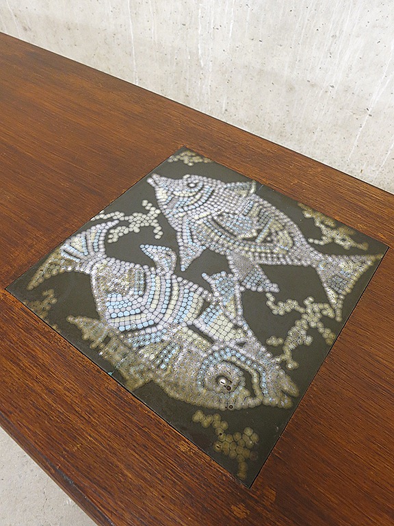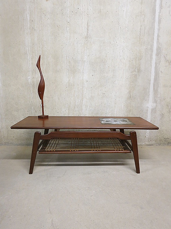 Design salontafel waarschijnlijk ontworpen door Louis van Teeffelen voor Webe in de jaren ‘60. Uitgevoerd in teakhout met ingelegde keramische tegel en een leg-plateau van riet. Zeer speciaal door de aparte tegel met mozaïek- visafbeelding. Het tegeltableau is waarschijnlijk van het Nederlandse aardewerk van Jaap Ravelli. Afmetingen: B 1.25 x D 0.49 x H 0.43 cm. De tafel is in goede vintage staat ( sporen aan het riet onderzijde tafel ) Door zijn mooie organisch vormgeving en optisch zwevend blad absoluut een eye-catcher! Prijs: verkocht