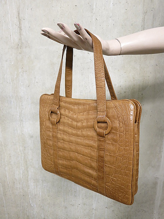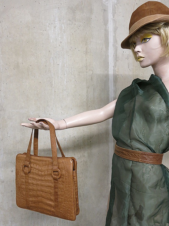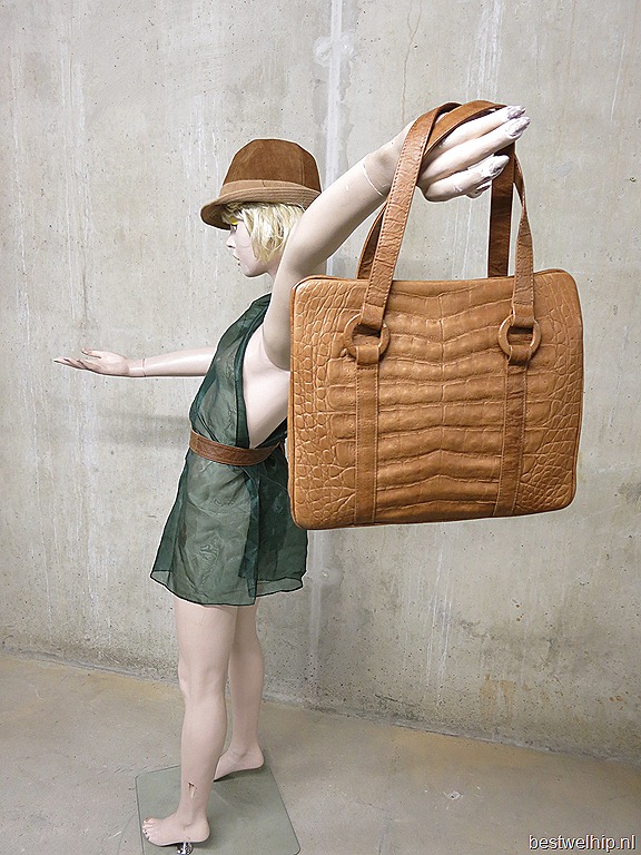 Stijlvolle leren vintage tas uit de jaren 50/ 60. Materiaal: leer in croco print. Kleur: camel. Voorzien van 3 binnen vakken waarvan het middelst vak is af te sluiten met een knip. Kleur: camel. Stoer & elegant tegelijker tijd. Behoort deze bijzonder vintage tas strakjes tot jouw tassen collectie? Prijs: verkocht