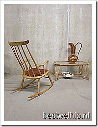 Zeldzame vintage Deense houten schommelstoel uit de jaren 50. Ontwerper: onbekend, doet denken aan Hans Wegner, Ercol en Ilmari Tapiovaraa. Prachtig in deze gelakte lichte berken kleur met een stoere cognac kleurige leren zitting. Deze rocking chair heeft een bijzondere vormgeving met oog voor detail. Gezien de leeftijd nog in zeer goede vintage staat. Heerlijk voor bij de openhaard of om de krant in te lezen. Danish vintage design I love it!