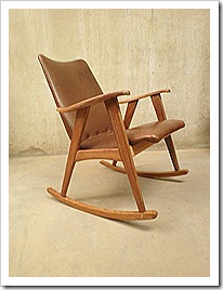 Heb jij altijd al een heerlijke schommelstoel willen hebben? In deze bijzondere schommelstoel kun je lekker in slaap schommelen. Prachtig vormgegeven relax fauteuil. Periode: jaren 60, Deense stijl. Ontwerper: onbekend doet denken aan de rocking chair van Webe. Materiaal: teakhouten frame en leren bekleding. Afmetingen: H91 x B70 x D74 cm.Deze vintage schommelstoel is geheel opnieuw gestoffeerd met prachtig zacht leer. Het houtwerk is ooit geschilderd geweest maar dit is weer teruggebracht in originele staat ( her en der nog enigszins zichtbaar maar niet storend ) Verder nog in zeer goede vintage staat. Deze Deense schommelstoel is zeer uniek en absoluut een bijzonder nostalgisch vintage object voor je in woonkamer. Prijs: verkocht