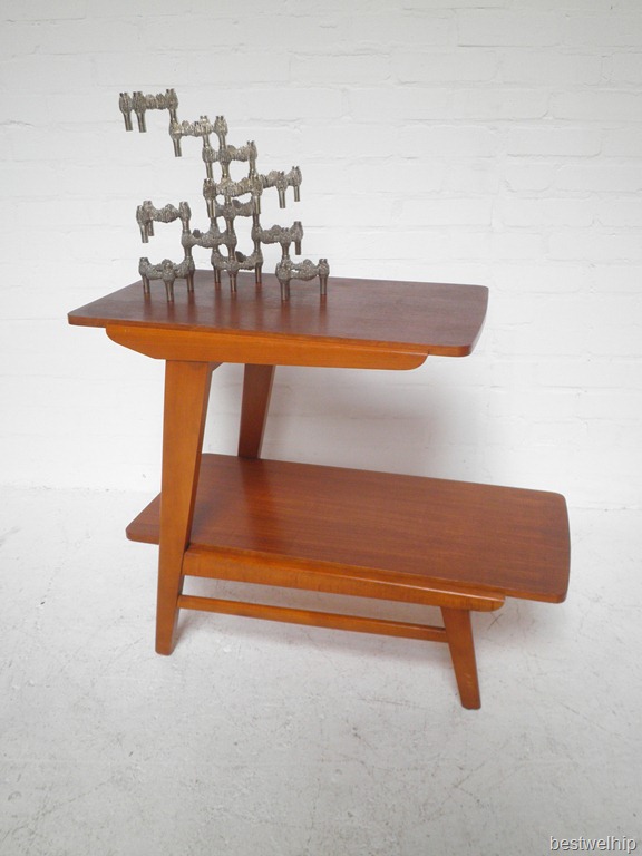 Bijzonder a-symmetrische side table in Deense stijl. Periode jaren: 50/60. Materiaal: teak hout. Mooi om neer te zetten als bijzettafel of tv tafel. Een stijlvol exemplaar prachtig in een vintage maar ook in een modern strak interieur. Afmetingen: B78 x D42 x H66 cm. Gezien zijn leeftijd in goede vintage staat (het bovenblad vertoont een lichte kring maar dit is weg te boenen) Een bijzondere bijzettafel. Prijs: verkocht
