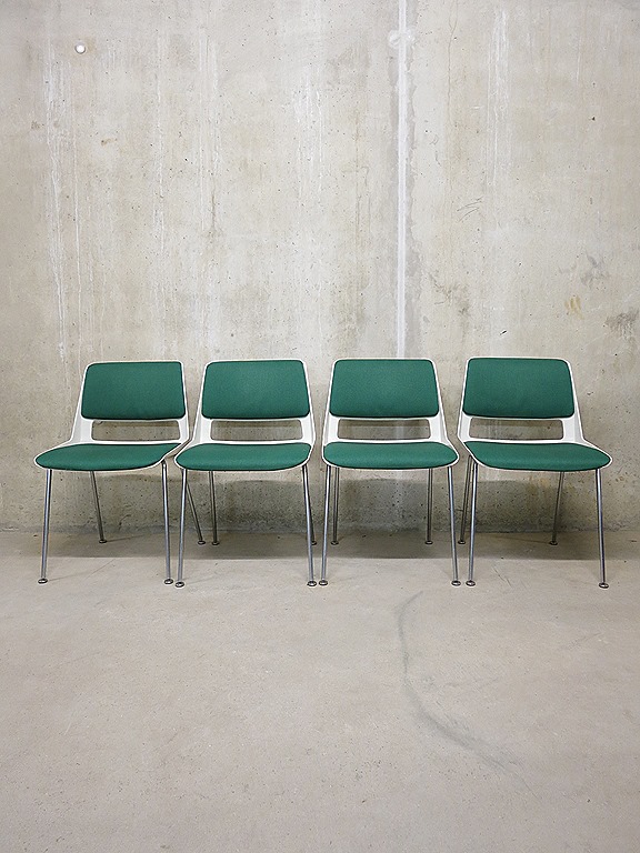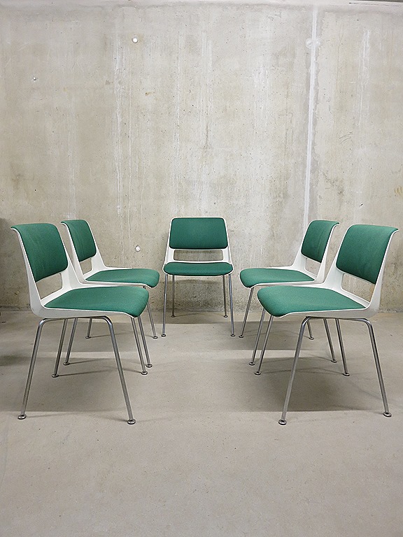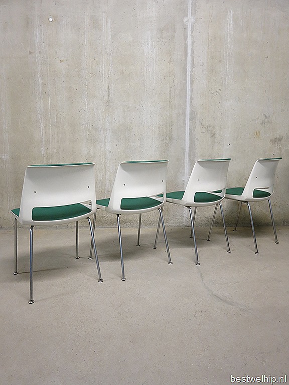 Prachtige originele vintage Dutch design stoelen van Gispen, een ontwerp van Andre Cordemeyer. Nog voorzien van originele ploegstof bekleding in een zeer mooie kleur ‘flessen’ groen. Model 2225. Periode: jaren 60. Materiaal: polyester kunststof kuip met daarin een stof gemonteerd zitvlak & rugsteun. Het metalen onderstel is van roestvrij staal met beweegbare ‘voetjes’. Enkele stoelen zijn nog voorzien van originele sticker aan de onderkant. Ze hebben een comfortabel zitcomfort. Gezien de leeftijd in goede vintage staat. Afmetingen: H77 x B47,5 x D50 cm, zithoogte 45 en zitdiepte 43 cm. Dit model is absoluut tijdloos en zeer in trek bij jong & oud. Na al die jaren nog steeds een icoon van de Nederlandse vormgeving. Prachtig voor aan de eetkamertafel thuis of in een restaurant/bar. Prijs: verkocht