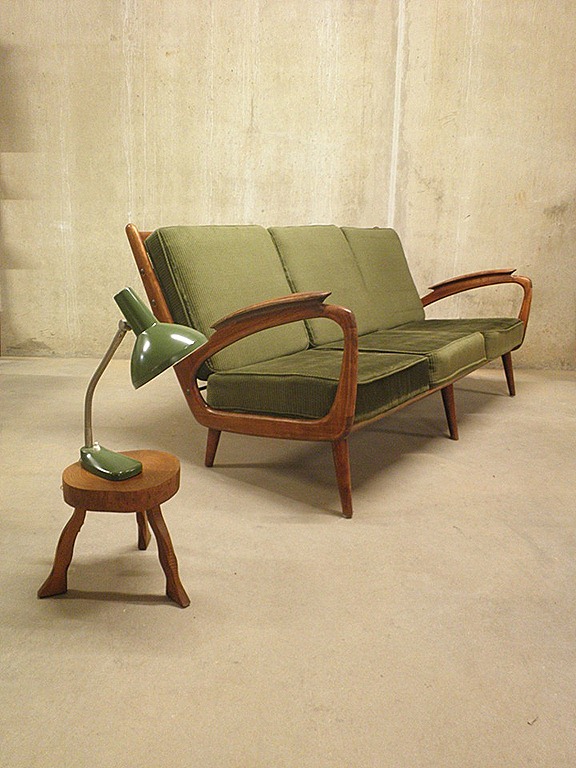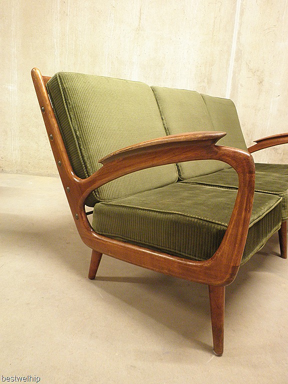 One of a kind! Zeer bijzonder vintage design lounge bank in Deense stijl. Ontwerper: onbekend. Periode: jaren 50. Absoluut een eye-catcher door zijn eigenzinnige en bijzonder mooi vormgegeven armleuningen. De bekleding is van groen rib velour, kussens voorzien van binnen vering. Afmetingen: B1.82 x D0.85 x H0.83 cm. Zithoogte: 0.40 cm, zitdiepte 0.51 cm. Nog in goede vintage staat. Prachtig voor in huis maar ook voor in een lounge hoek van een hotel of restaurant. Prijs: verkocht
