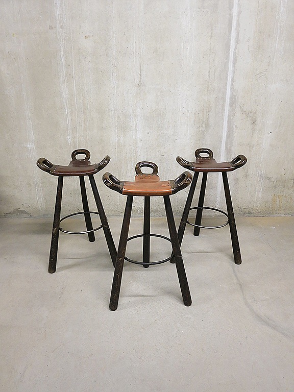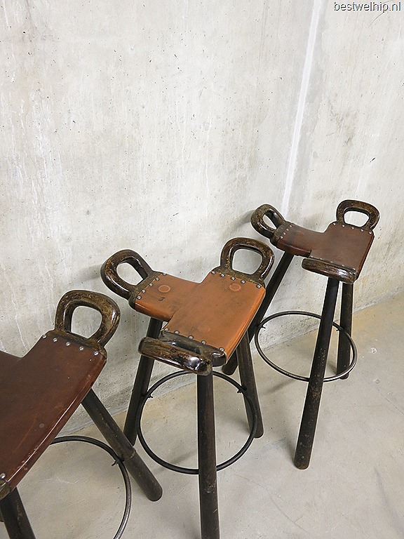 Uniek in zijn vormgeving, ook wel ‘Spanish’ stool genoemd, bijzondere zeldzame vintage design krukken. Periode: 1965. Land van herkomst: Spanje. Gemaakt van zeer dik zwaar hout in combinatie met metalen ring. Anders dan anders.. omdat deze bekleed zijn met stoer doorleefd bruin/camel leer. Afmetingen: H0.84 x B0.52x D0.47cm, zithoogte is 0.76 cm. Nog in zeer goede vintage staat. Deze stoelen zijn zeer decoratief & prachtig voor in een bar/restaurant/ hotel of lobby maar ook in een Scandinavisch interieur. Heb jij die opdracht om een mooie bar/ lobby in te richten dan is dit wellicht wat jij zoekt! Stoer & stijlvol tegelijk, een eye-catcher voor aan de bar. Prijs: verkocht