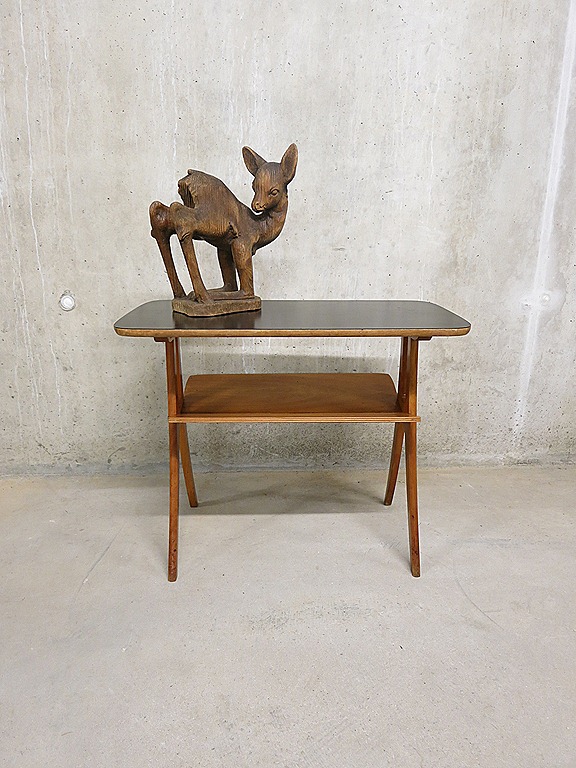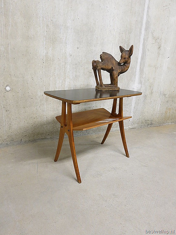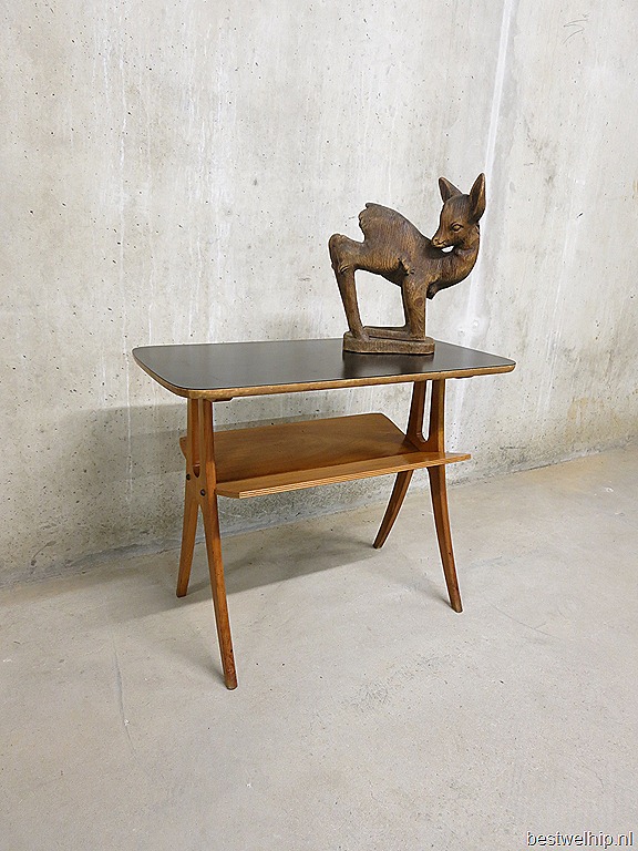 Bijzondere vintage design lectuurbak/ magazinerack en bijzettafel in 1. Ontwerper: onbekend, Deense stijl Periode: jaren 60. Materiaal: prachtige tweekleurige houten lectuurbak met een zwart formica blad. Prachtig contrast tussen het strakke bovenblad en en de warme houten poten/ lectuurbak. Mooi door zijn eenvoud! Ideaal om je tijdschriften in op te bergen en handig als bijzettafeltje naast de bank/ fauteuil. Afmetingen bovenblad: B0.70 x H0.56 x D0.37cm. Gezien de leeftijd in goed gebruikte vintage staat. Mooi in zowel een vintage als modern interieur. Veroverd dit exemplaar straks zijn plekje bij jou naast de bank? Prijs: verkocht