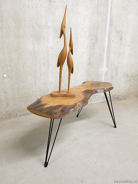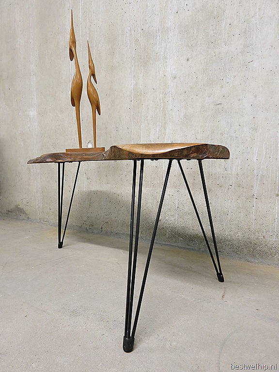Erg mooie vintage design boomstamtafel met zwart metalen draadpoten/ span poten. Een zeer mooi en stijlvol blad in zeer goede vintage conditie. Ideaal als salontafel en makkelijk om bij te zetten door zijn bescheiden afmetingen. Afmetingen: H46 x B96 x D39 cm, dikte tafelblad 4 cm. Bijzonder mooi te combineren in een modern interieur. Absoluut een sfeermaker in huis. Staat deze straks bij jou in de woonkamer te pronken? Prijs: verkocht