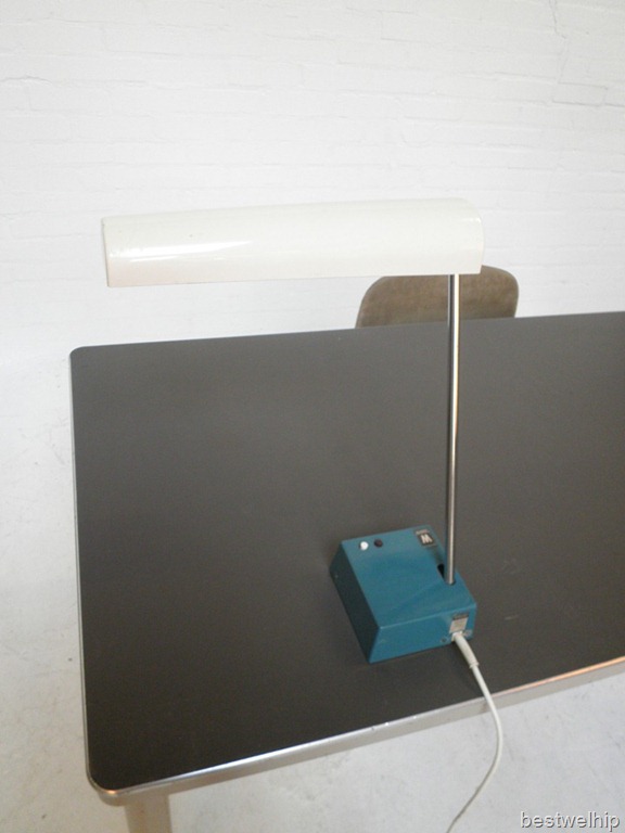 Stijlvolle strakke vintage design bureau lamp ‘Odette’ Bauhaus, TL 218, naar het ontwerp van Wolfgang Tümpel (1903-1978) geproduceerd door Waldmann Leuchten, Schwenningen. Periode: 1962 Bauhaus jaren. Langwerpige kap met twee drukschakelaars en aan de zijkant de verstellen. Kleuren: crèmekleurige kunststof kap, metalen arm verchroomd, matrozen blauwe vierkante voet met drukschakelaar. Door flexibele arm in hoogte verstelbaar (H43cm). In deze kleurstelling vrij uniek. Nog in zeer goede vintage staat. Deze design klassieker is voor de liefhebber echt een’ wannahave’.