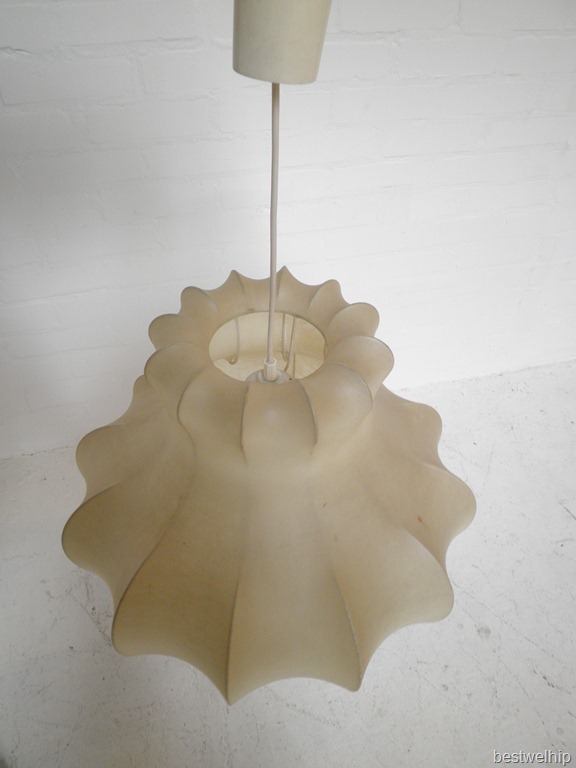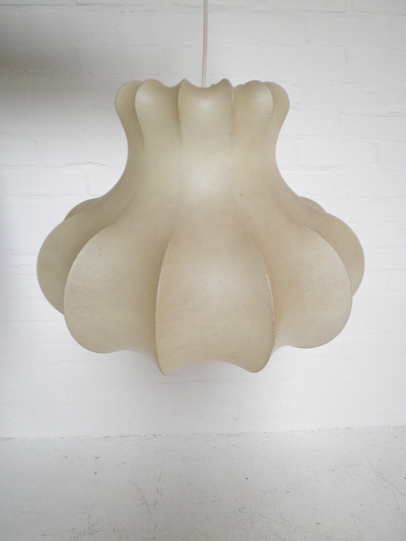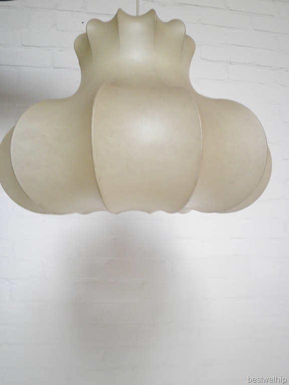 Helemaal hip en terug van weggeweest is deze geometrische Cocoon lamp. Doet denken aan de lampen van Achille Castiglioni, Italiaans. Periode: 1960. Tegenwoordig ook terug te zien als inspiratie in de collecties van Marcel Wanders en Moooi. Afmetingen: doorsnede breedste gedeelte is +/- 48 a 49 cm. Dit vintage exemplaar is nog in zeer goede staat. Materiaal : een gebogen metalen frame bedekt met ‘Cocoon’ spray-on fibreglas coating. Geeft prachtig diffuus licht. Prijs: verkocht